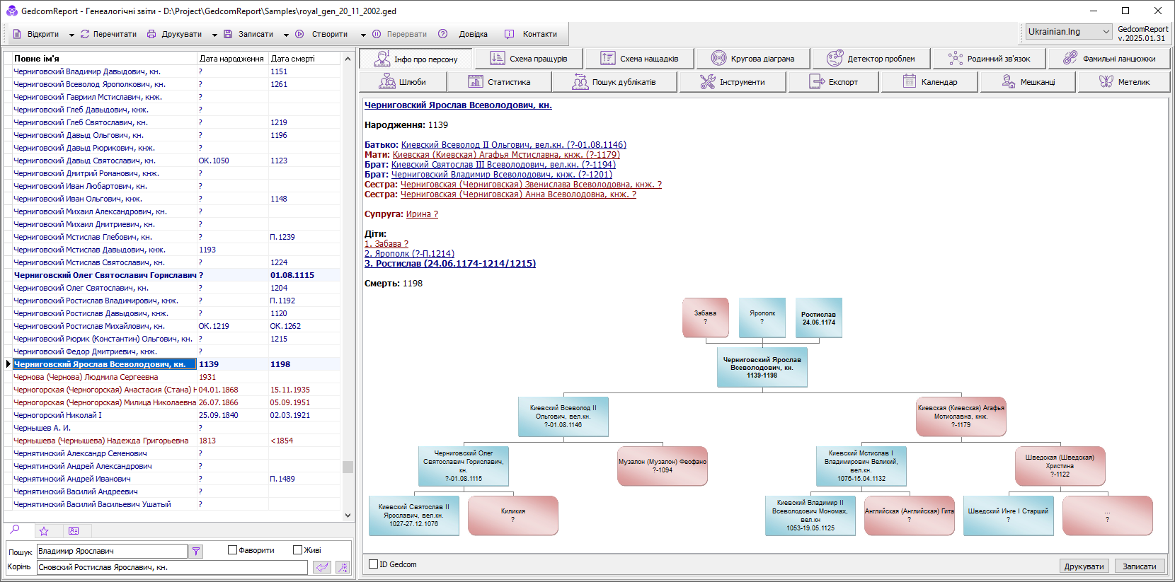 Клік по будь-якій персоні як у текстовій частині так і у міні-дереві (кожна з яких є своєрідним гіперпосиланням) переміщає на неї в списку і автоматично відображає інформацію вже від неї.