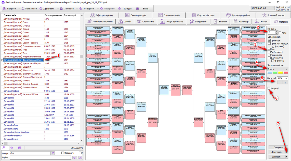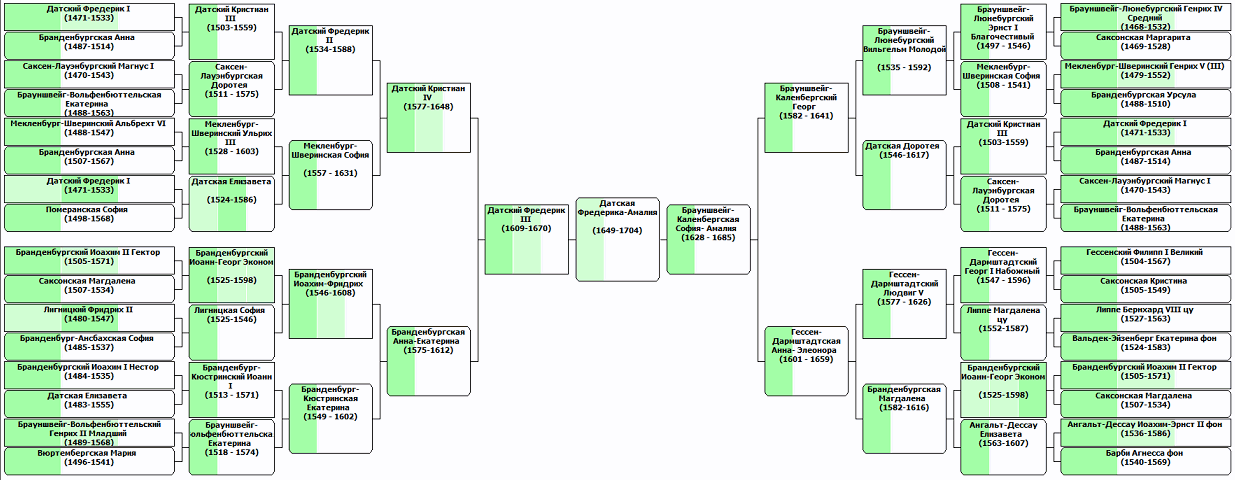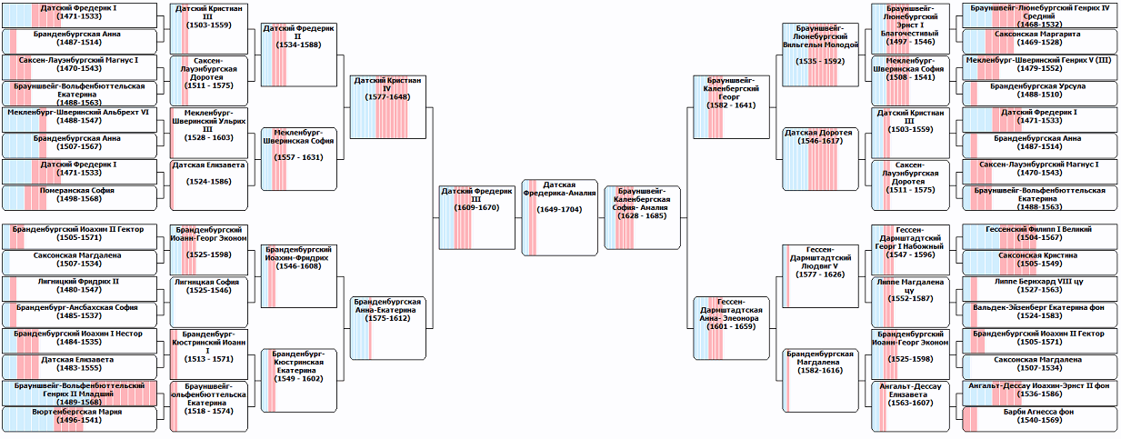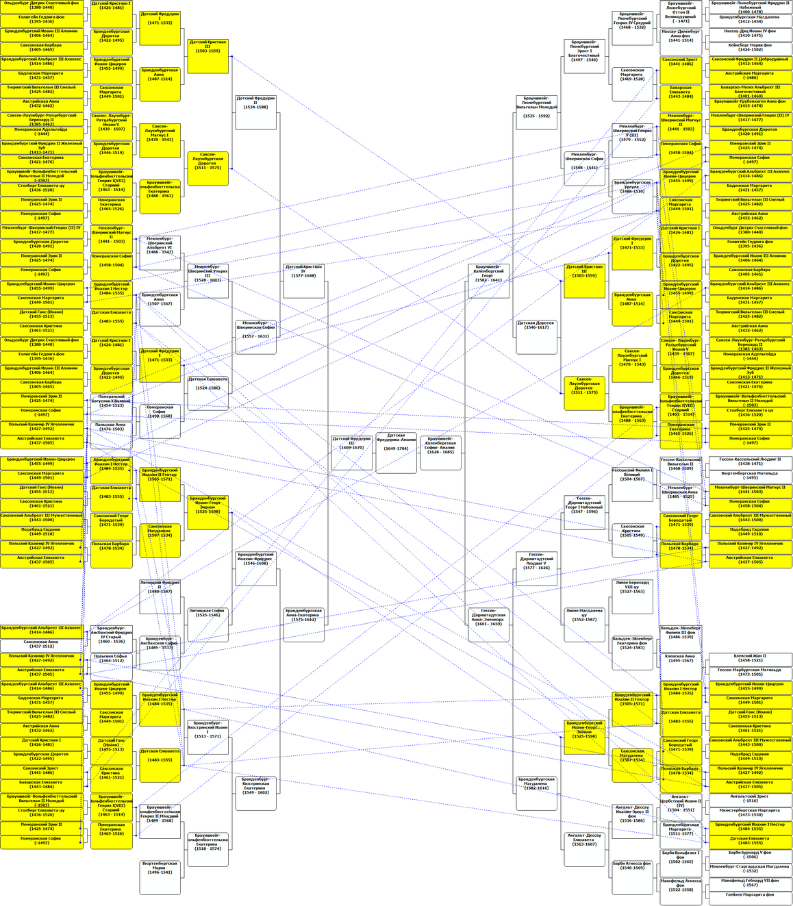 Як бачимо, ті самі персони у дереві зустрічаться двічі і навіть тричі (як Датський Фредерік I). Персони, які зустрічаються у дереві більше 1 разу виділено жовтим кольором. З'єднання комірок відбувається тільки до першої (найближчої) персони, решта просто виділяється кольором (щоб кількість ліній не заважала суті). З'єднано лініями тільки ті персони, які входять у ту кількість поколінь, яке встановлено у налаштуваннях звіту. Але це не означає, що решта персон не мала "двійників" у інших гілках. Просто ми обмежилися тільки цією кількістю поколінь. Є персони, які зафарбовано "жовтим", але вони не мають з'єднувальних ліній. Це означає, що редукція має місце, але ця персона присутня у дереві в інших гілках у тих поколіннях, які не входять до діаграми у зв'язку з тим, що ми обмежили діаграму заданою кількістю поколінь. На прикладі вище таке подружжя ("жовте" та без зв'язків) знаходиться у нижньому лівому кутку. Якщо ми збільшемо кількість поколінь ще на 2 (до 8-ми), то діаграма буде вже такою, як нижче, і ми бачимо, що ті 2 персони вже мають зв'язок і він є у більш ранньому поколінні. Та й самих зв'язків значно побільшало.
