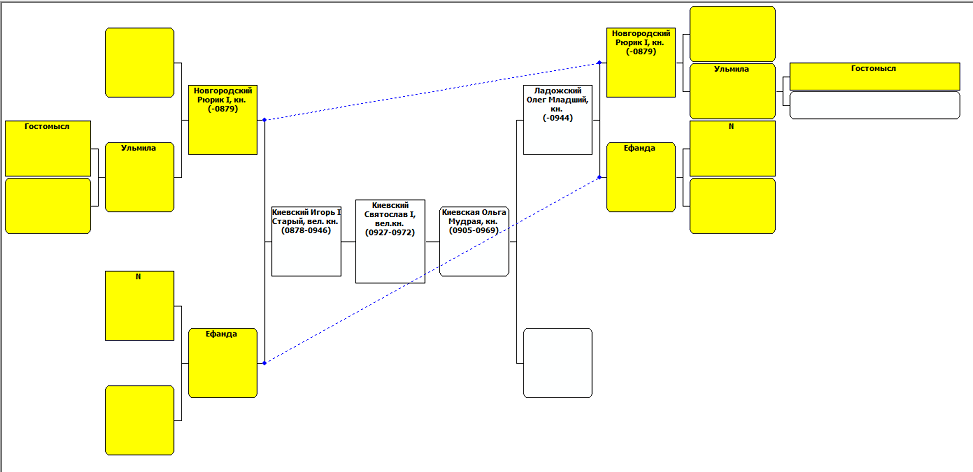 Тобто, майже всі персони у 6-7 поколінні від центральної, зустрічаються більше 1 разу у інших гілках. Вражає... Звісно, ми здебільшого "не граф'я", і у нас таких випадків буде набагато менше. Та й міграції останнього століття розширили географію для вибору супутника життя, що значно зменшило кількість родинних шлюбів. Просто цей приклад гарно показує суть цієї опції і у мене давно чухалися руки втілити у свою програму такого плану звіт, пристойних аналогів якого я не знайшов. Але й у моєму дереві серед прямих пращурів є з пів-десятка випадків, коли одна й та саме персона присутня у пращурах іншої гілки. Два з них (принаймні відомих мені) є й серед моїх нащадків. Ну і під кінець, щоб завершити опис опції "Редукції", наведу ще один маленький приклад, який буде простіше сприйнято, ніж таємниці датського двору.. У цьому прикладі Великий князь Київський Ігор I народив сина від доньки свого рідного брата Олега Ладожського. Тобто, від рідної племінниці народився великий князь Київський Святослав перший. Отак це все виглядає у програмі, якщо побудувати звіт від Святослава: