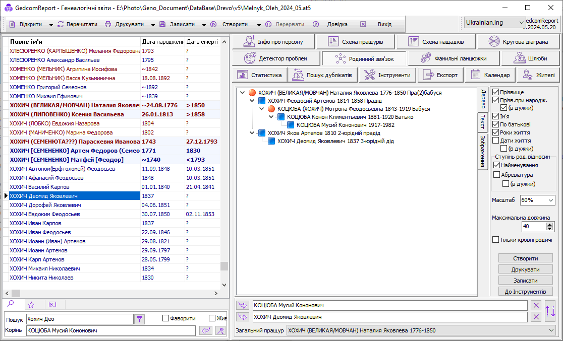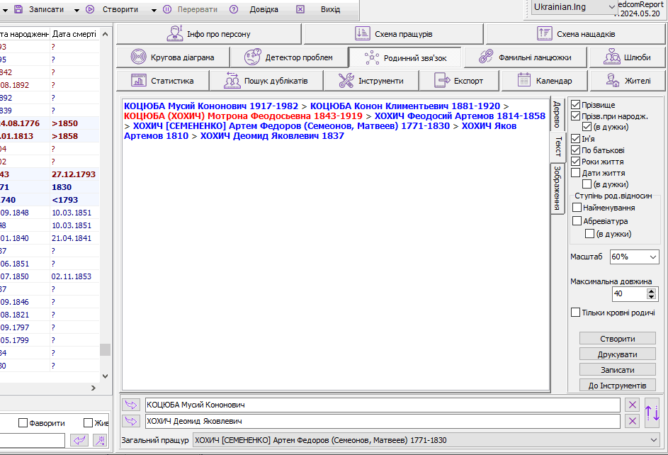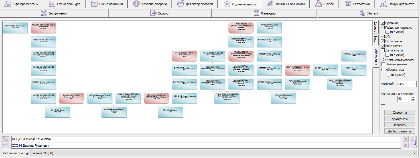 Вибирайте 2 особи зі списку (за допомогою кнопок або просто перетягнувши їх у поля внизу) і формуйте міні-дерево зі зв'язком даних осіб. Цей зв'язок можна спостерігати у вигляді схематичного дерева або просто як текст (ці види розташовуються на закладках):