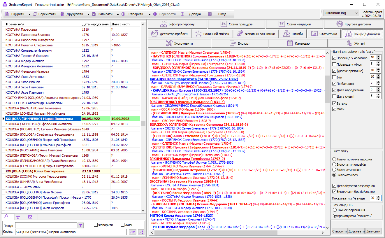 Пізніше у звіті з'явилася можливість враховувати батьків персон; при їх порівнянні на предмет дубляжу (опції Батько, Мати ). Тобто крім коефіцієнта порівнюваних персон за схожим алгоритмом порівнюються й його батьки, що у деяких випадках дозволить збільшити точність порівняння. Відмінність при порівнюванні персон та її батьків полягає в тому, що до уваги не береться прізвище батьків (крім дівочої у матері). Як правило, це прізвище у батьків та дітей збігається, і якщо цього не зробити, то невиправдано підвищиться % збігу.