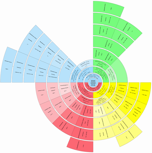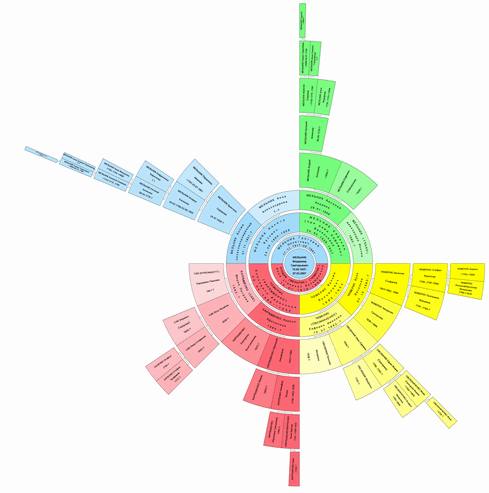 Залежно від повноти дослідження поколінь можна вибрати найбільш прийнятний варіант, щоб і написи були читані і особливо не страждали пропорції розміру секторів. Даний вид розміщення осередків кругової діаграми повністю оригінальний, тобто придуманий мною та аналога такого розміщення в інших генеалогічних програмах я не зустрічав. Крім цього з'явилася можливість вибору вибору кольорів у всіх видах кругових діаграм (у разі, якщо обрано Двоколірний або Багатокольоровий варіант). Вибрані кольори будуть запам'ятовані, проте їх завжди можна скинути до стандартних (при виборі кольору стандартні кольори будуть у блоці Додаткових кольорів). |