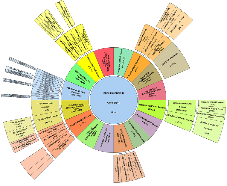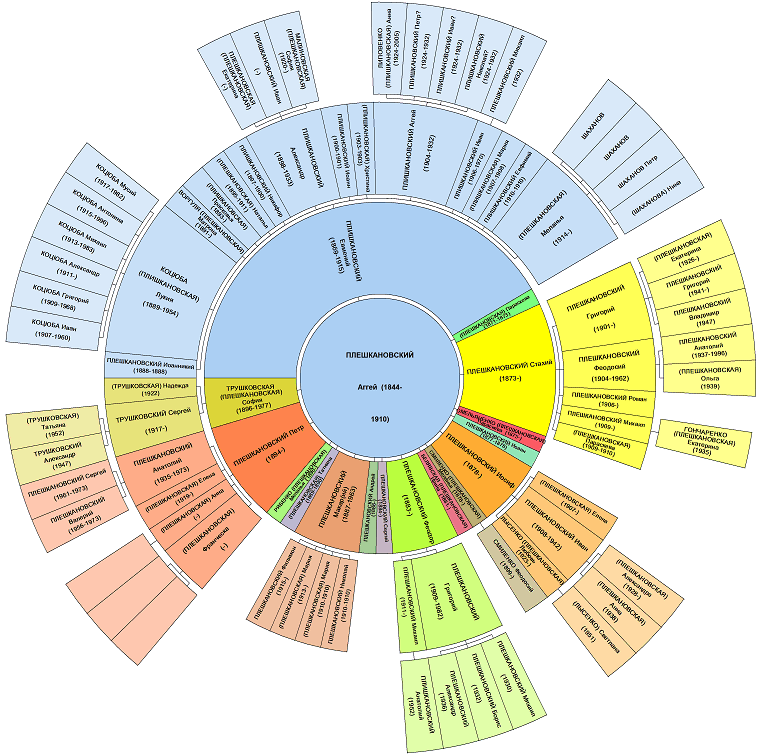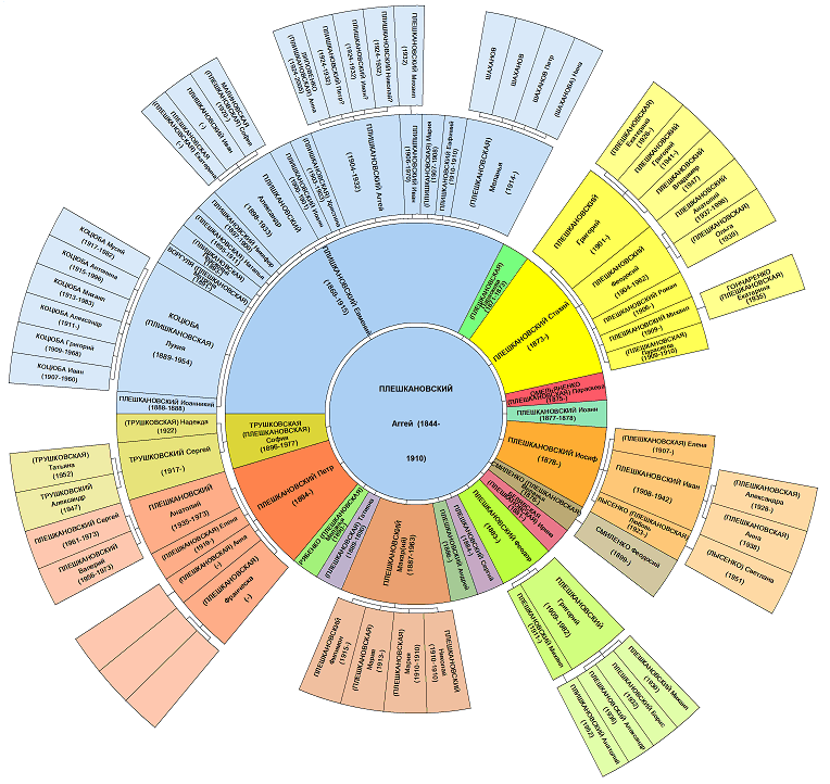 Види діаграм У разі діаграми нащадків є сенс вибирати різновиди сотових діаграм. Як правило, при дослідженнях окремі "гілки" нащадків заповнені набагато краще, ніж інші. І кругова діаграма набуває вигляду, коли в одних персон кількість нащадків (секторів) невелика, а в інших набагато більше (як дітей таки і онуків, правнуків тощо). У випадку вибору Пропорційної діаграми, розміри комірок у всіх дітей кореневої персони однаковий, у всіх наступних поколіннях розмір комірки зворонтьопропорційний кількості дітей - чим дітей більше, тим комірки будуть вужчими. Тому якщо дітей багато (як у "синьому" секторі на прикладах нижче) розмір розрахованих комірок може бути настільки малий, що страждає сприйняття інформації. Задля запобігання цього ефекту було розроблено оптимальні різновиди цієї діаграми. Два види сотових діаграм (оптимальні) дозволяють оптимізувати місце у найдальших від кореневої персони нащадків у таких ситуаціях, збільшивши розмір осередків за рахунок наявності вільного місця відсутніх персон у "кузенів". Ці різновиди діаграм використовують трохи різні алгоритми розміщення: "Сотова оптим.1" у цьому сенсі має більш "зважений" режим, а "Сотова оптим.2" - більш "агресивний" (перевага більше надається багатодітним родинам за рахунок бездітних). Таким чином досягається мета, щоб у нащадків на останньому поколінні розмір комірок був однаковий. Але краще 1 раз побачити, ніж пояснити словами. На малюнках, що наведені нижче, розташовані всі 3 різновиди діаграми, побудовані від однієї і тієї ж персони Сотова пропорційна
