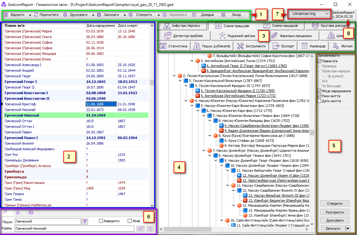 6. Панель пошуку та фільтрації персон у списку. Ця панель служить для налаштування зовнішнього вигляду списку осіб (формат імені, виділення кольором), а також для їх пошуку та фільтрації за різними ознаками. Докладніше про це у розділі Панель навігації