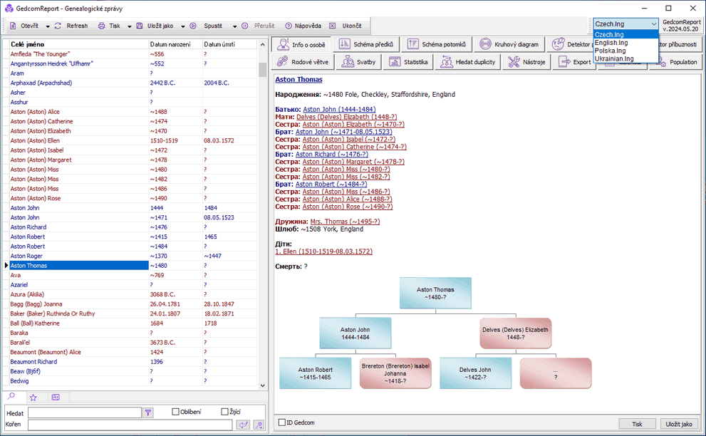Структура мовного файлу: Секція [Language] містить усі елементи інтерфейсу, а також словосполучення, що зустрічаються у звітах Секція [*Language], що містить назви родинних відносин