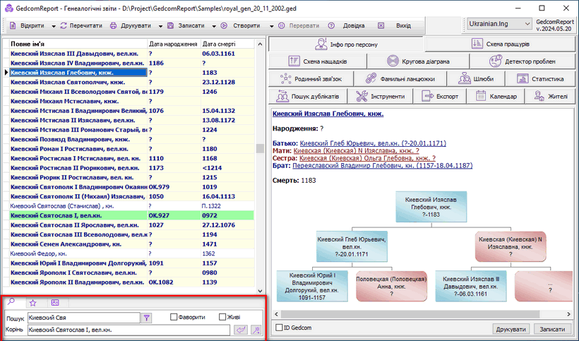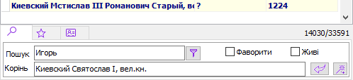 Якщо кнопка праворуч від поля Пошук не натиснута ( Фільтр ), у міру введення тексту курсор переміщається у списку персон до найближчої персони, задовольняє введеному умові. Якщо кнопка Фільтр натиснута, то список фільтрується відповідно до цієї умови. Регістр букв при виборі не має значення. При цьому пошук допускає наявність між словами інших слів, наприклад пошук персони "Іванова Ганна" знайде (або відфільтрує) і персону "ІВАНОВА (ПЕТРОВА) Ганна Яківна". Також під час пошуку можна користуватися символами "*" (один або кілька будь-яких символів) та "?" (Один будь-який символ). Так пошук "Іванів *ков" знайде і "Іванов Яков" та "Іванов Іяков" та "Іванов Сидір Якович" Також персон можна відфільтрувати за ознакою Фаворит (хто такі Фаворити налаштовується на окремій закладці, про це нижче), а також обмеживши вибір тими персонами, які в даний момент живі . Живими є персони, у яких відсутня подія "Смерть". Наявність дати смерті або її відсутність не є в цьому випадку визначальною. Фаворити обчислюються і від " кореневої " персони. Коренева персона вибирається вручну (за допомогою кнопки зі стрілкою праворуч від поля або перетакуванням зі списку персон у поле "Корінь") або вибирається програмою автоматично за допомогою кнопки з "Чарівною паличкою". При натисканні на кнопку пропонується вибрати з меню принцип визначення кореневої персони: