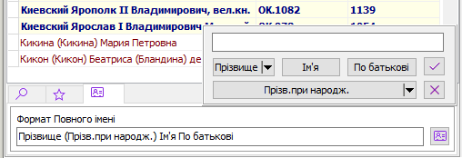 Для початку налаштування натисніть кнопку праворуч від поля, де зберігається формат імені. Налаштування виконується просто, клацаючи на кнопках, як на калькуляторі. Залежно від того, які кнопки і в якій послідовності натиснуті, в такій послідовності і складатиметься повне ім'я. Якщо поряд з кнопкою є маленький трикутник, то натискання на нього означає, що ця складова імені буде взята в дужки. Після закінчення набору натискаємо кнопку із галочкою і наш список персон переформується з урахуванням нових налаштувань. Копка з хрестиком – відмова від зміни формату імені. Є ще один спосіб переміщення по персонам у списку персон. Для цього просто можна клацати за посиланнями (підкреслені персони) у звіті "Інфо про персону" і покажчик у списку персон переміщатиметься на обрану персону. Будь-яку з них у будь-який момент можна встановити як кореневу, за рахунок чого список Фаворитів перерахується відносно цієї персони. |