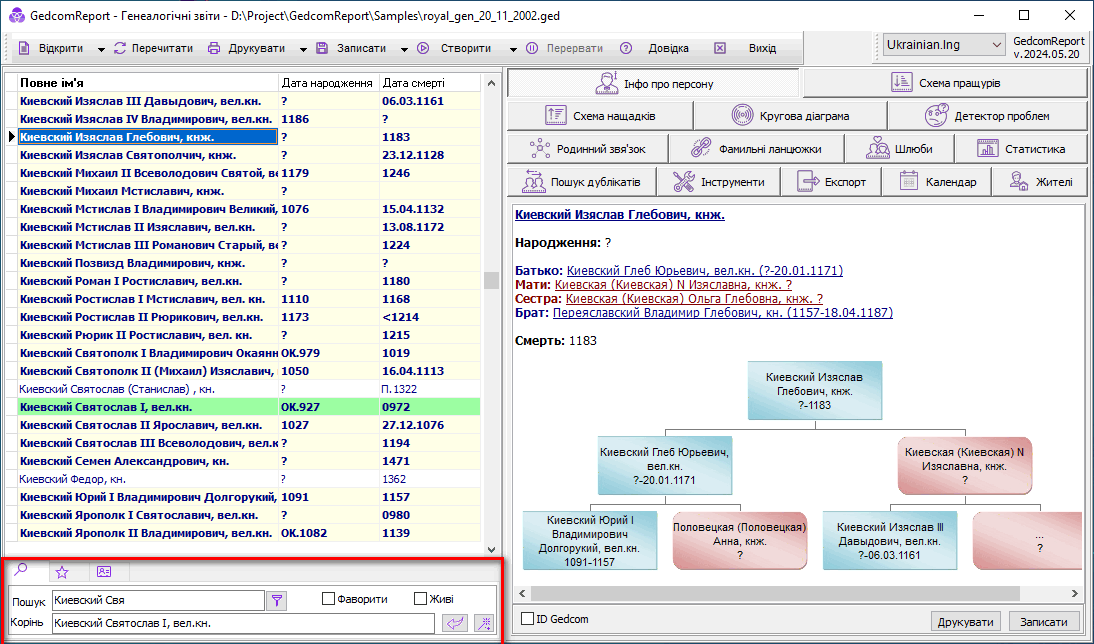 Якщо кнопка праворуч від поля Пошук не натиснута ( Фільтр ), у міру введення тексту курсор переміщається у списку персон до найближчої персони, задовольняє введеному умові. Якщо кнопка Фільтр натиснута, то список фільтрується відповідно до цієї умови. Регістр букв при виборі не має значення. При цьому пошук допускає наявність між словами інших слів, наприклад пошук персони "Іванова Ганна" знайде (або відфільтрує) і персону "ІВАНОВА (ПЕТРОВА) Ганна Яківна". Також під час пошуку можна користуватися символами "*" (один або кілька будь-яких символів) та "?" (Один будь-який символ). Так пошук "Іванів *ков" знайде і "Іванов Яков" та "Іванов Іяков" та "Іванов Сидір Якович"