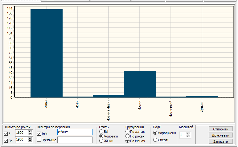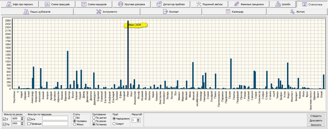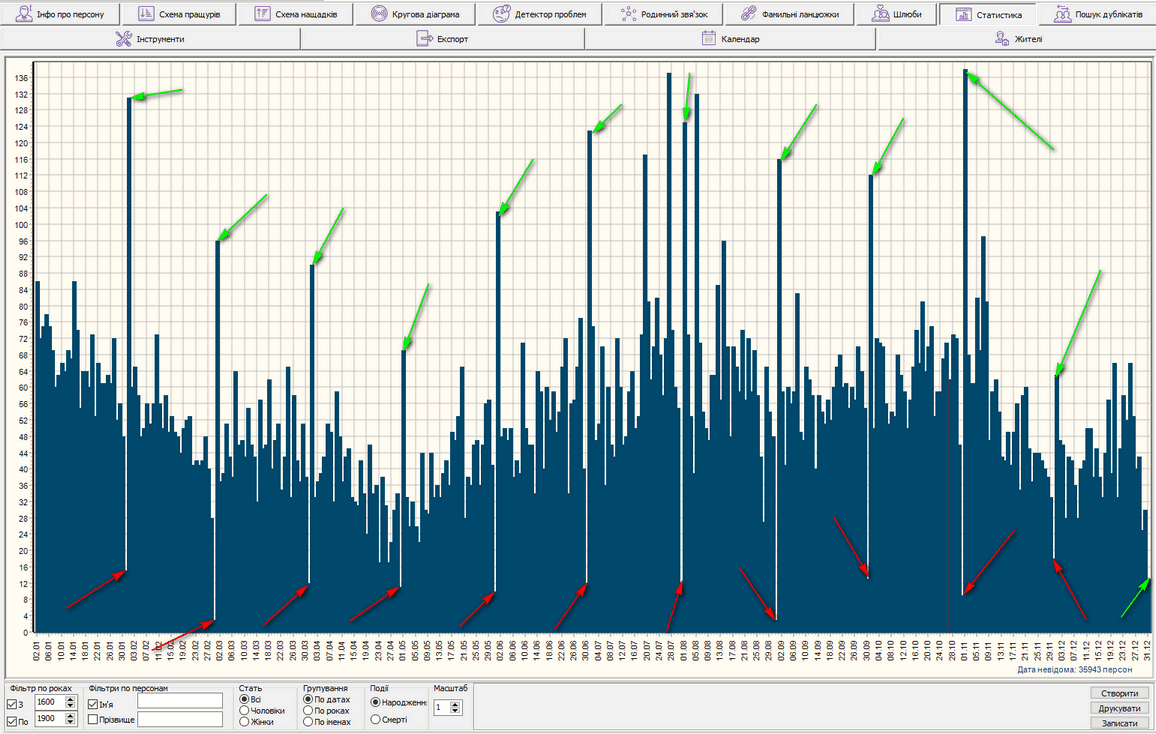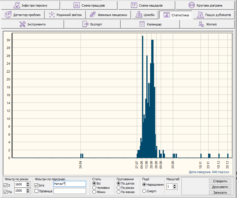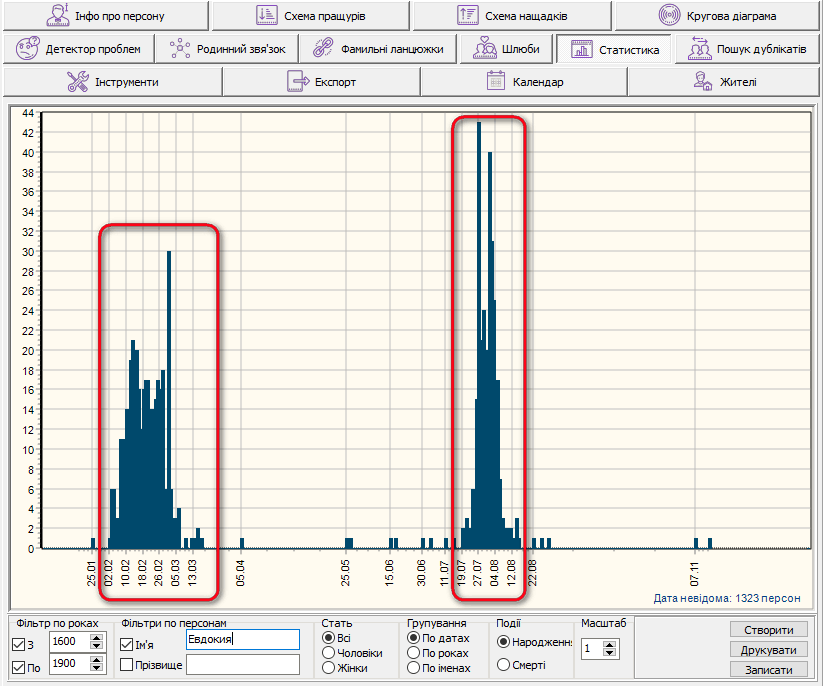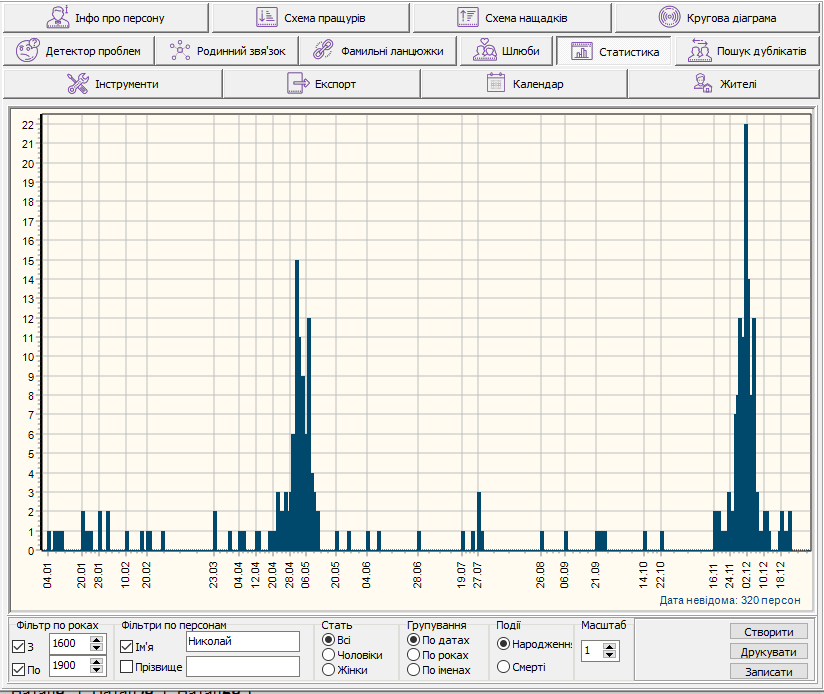 ![]() Відразу хочу попередити, що якщо у вашій базі менше, як мінімум, кількох тисяч людей або якщо вони народилися не раніше, ніж 100 років тому, то побудова за нею статистики мало що вам дасть, оскільки після революції називати немовлят за святками не було прийнято і побудова статистики, включаючи ці роки, буде не показовою. Для цього у звіті є фільтр за датами. Принагідно, ідея звіту згодом була розвинена, додана можливість виведення не лише дат народження, а й смерті, доданий спосіб угруповання даних. Крім угруповання за датами є можливість згрупувати дані з років, тобто. скільки на який рік потрапляло народжень-смерті (наприклад, для аналізу епідемій тощо).