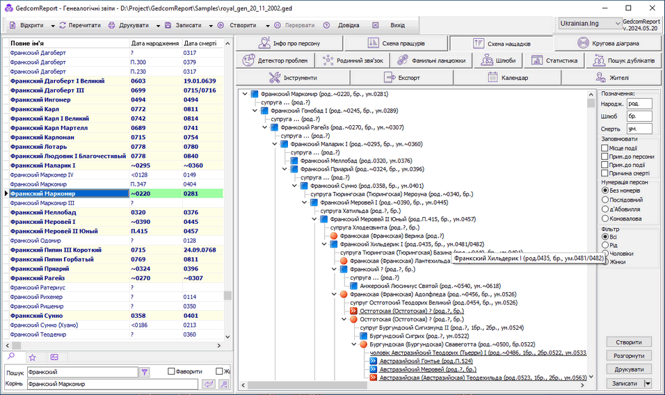 Також у версії 2016.11.11 з'явилася можливість відфільтрувати персон у дереві, що виводиться. Крім повного режиму (Всі), є можливість виведення Роду персони (дочки присутні у дереві, але їх нащадки вже не представлені), уявлення лише нащадків чоловічої чи жіночої статі. Друк Схеми нащадків здійснюється з повністю розгорнутими гілками вистави і максимально наближено до того виду, що видно на екрані (при виборі принтера можна вибрати Портретну або Альбомну орієнтацію паперу)