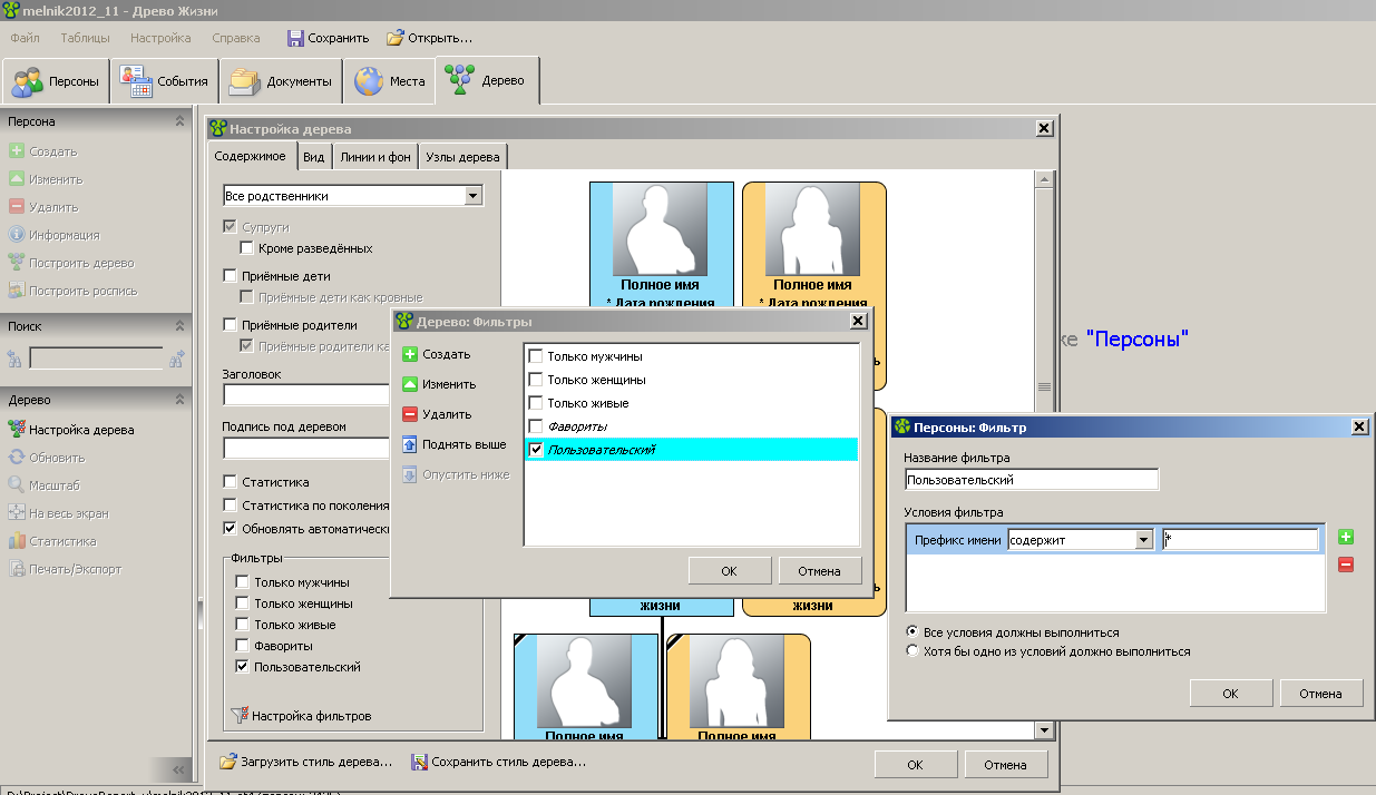 персон зробити відмітку тільки предків, по іншій нащадків,