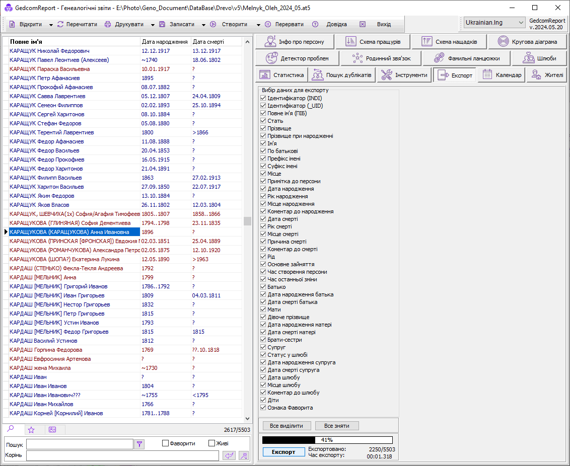 Починаючи з версії 2019.06.12 до експорту додалося ще 16 полів, які відносяться не до самої персони, а до пов'язаних з нею персон і родин.
